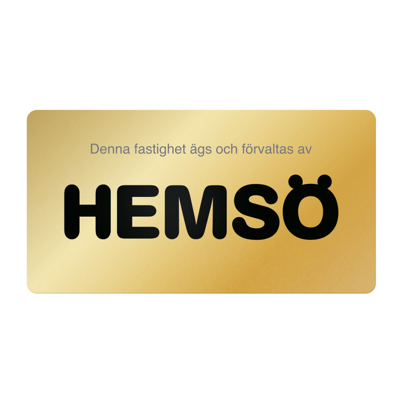 Elegant mässingsfärgad plåtskylt med utstickande logotyp ca 1,5mm med svart gravyr.