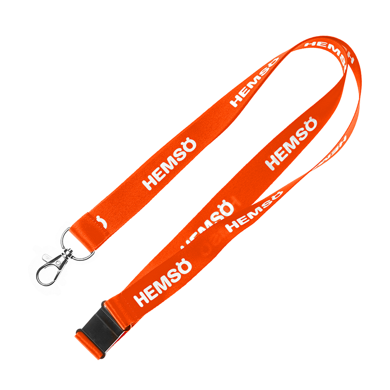 Logoband i polyester 20mm med karbinhake och säkerhetsspänne.