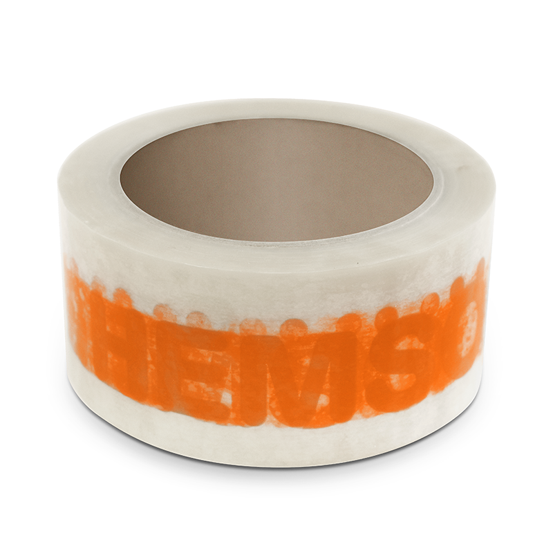 Genomskinlig packtejp med orange logotyp, 50mm PVC Solvent av mycket hög kvalitet.